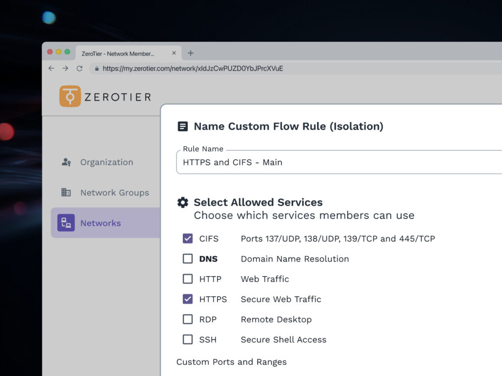 In ZeroTier’s new Central, flow rules are now delivered through UI-based templates. Our first template release for network isolation, covers the widest array of use cases seen in ZeroTier deployment. It offers a focused set of policy controls that define how traffic moves within a network. It’s a menu of settings rather than a single switch or a deep scripting interface, providing a clear starting point with room to customize. This template is the first of many, setting the foundation for additional templates, and enhanced full scripting capabilities, that make powerful network policies easier to deploy as Central continues to evolve.